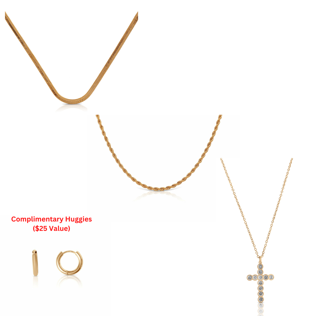 This beautiful set was put together for the Bold & Beautiful! This bundle contains 3 ea separate chains to stack together or wear separately to create a different look every time! This bundle contains a trendy herringbone necklace, and a rhinestone cross necklace! With the purchase of this set comes a pair of complimentary classic huggies valued at $25.